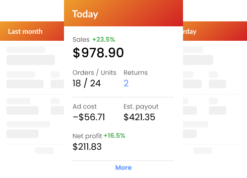 View your sales, orders, refunds, advertising costs, estimated payout and net profit at a glance and easily compare performance with the tile view.